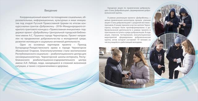Центральной городской библиотекой имени А.С.Пушкина г. Черногорска Республики Хакасия выпущен комментированный фотоальбом «ДоброВолец» с наглядной информацией о реализации проекта, получившего поддержку конкурса малых грантов «Доброволец-2018» программы «Православная инициатива».