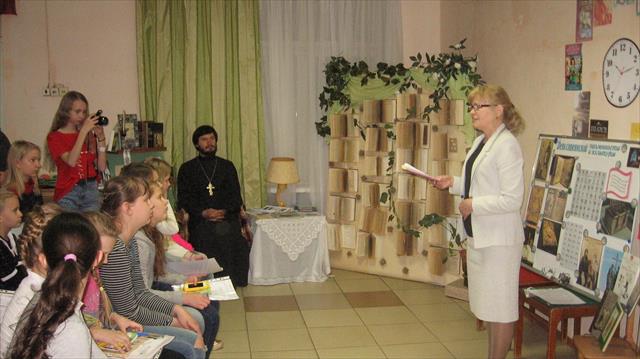 Далее батюшка рассказал о значении славянской письменности и важного духовного чтения. Библиотекарь Ираида Николаевна Тетерина провела беседу о святых братьях Кирилле и Мефодии и литературную игру, а педагог воскресной школы Зоя Георгиевна Романенко - викторину по этой же теме.