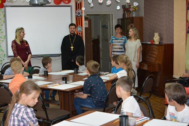 Мероприятие проводилось в виде открытого урока, на котором к детям и их родителям обратились с теплыми напутственными словами и поздравили с началосм обучения руководитель проекта - заместитель директора ГБУСО «Невинномысский КЦСОН» Семенова О.Н., иерей отец Георгий Калядин (Храм Казанской иконы Божией Матери), Наталья Ивановна Бойко педагог – художник.