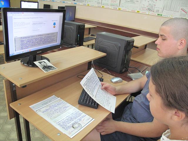 Практическая работа «Поисковые системы, помогающие найти родственников, людей, пропавших без вести, в том числе во время Великой Отечественной войны» была организована в кабинете информатики, ребятам предстояло выйти в интернет и посетить сообщества, где они могли бы узнать сведения о своих родственниках, воевавших за Родину в великой отечественной войне. В.Н. Беловолов, учитель истории и обществознания МБОУ СОШ № 6, начал мероприятие с беседы с ребятами об их родственниках, героически сражавшихся на войне, не думая о смерти, метая о счастливом будущем потомком. Школьники с гордостью рассказывали о своих дедах и прадедах, вспоминая их боевой путь. Учитель предложил пополнить семейные архивы ребят копиями документов, которые можно найти в архивных сетевых сообществах. Как радовались школьники, отыскивая документы, с каким взглядом они читали о своих героических предках. Кто-то не знал о наградах своего дедушки, кто-то обнаружил сведения о том, за что получена награда, какой подвиг совершен его дедом.