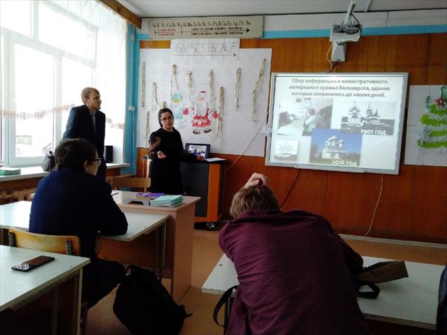 Последний этап работы по проекту уже завершён. 11 января состоялась презентация проекта для учащихся 10 классов МОУ «СОШ №1 им. И.П.Малозёмова» г.Белозерска. Сотрудники проекта: Кузнецова Н.В и Зимарёв А.В. рассказали о том, как велись работы в рамках реализации проекта, чем он полезен для подрастающего поколения и провели опрос среди десятиклассников, который показал, что 98 % опрашиваемых ранее уже слышали о данном проекте, положительно относятся к его идее и считают его полностью реализованным.