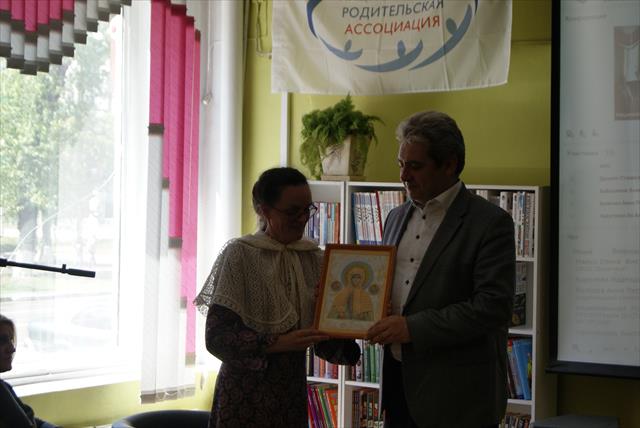 Гостю были представлены 2 проекта Амурской области, которые были отмечены Комитетом Государственной Думы по вопросам семьи, женщин и детей Сертификатом о присвоении знака качества информационной среды: «Восхождение к истокам», «Дневник школьника Белогорского района». Проект «Восхождение к истокам» был поддержан Международным открытым грантовым конкурсом «Православная инициатива 2017-2018». Проект был представлен Москалевой Мариной Викторовной, заместителем директора по воспитательной работе МБОУ Садовской СОШ совместно с иереем Александром Гладких и председателем родительского комитета МБОУ Садовской СОШ, Рафальской Н.Б. Марина Викторовна рассказала о проекте «Восхождение к истокам», разработанном для учащихся школ Тамбовского района Амурской области. Цель - нравственно-духовное развитие через восстановление исторической памяти участников проекта, амурчан, их знакомство с православными амурскими святынями, с историей освоения и развития Дальнего Востока, формирование любви к малой родине, желания связать свою жизнь с Приамурьем. Примечательно, что данный проект осуществляется совместно с приходом преподобного Сергия Радонежского (с. Тамбовка). Это, действительно, помогает возвращаться к традиционным истокам, когда во время освоения земли Приамурской любое дело начиналось с молебна, с освящения нового места, со строительства нового храма. Проект «Восхождение к истокам» напомнил школьникам и родителям о православных традициях, что важно для приграничных территорий, и является гарантией защиты от чужеродных культурных влияний, формирует в коллективном сознании местного социума информационный иммунитет к негативным информационным воздействиям в СМИ. Выступление М.В.Москалёвой дополнил о.Алексендр (Гладких), который очень лаконично и ёмко нарисовал портрет традиционной православной семьи, которая будет способствовать формированию духовно и нравственно здоровой личности, а для этого нужно придерживаться традиционного в России уклада семьи, где главную роль занимает отец, а мать воспитывает детей, а не уделяет большее количество своего времени работе и зарабатыванию денег. Нравственное благополучие семьи всегда оказывается не менее, а скорее более важным фактором нежели финансовое благополучие. На память о посещении Амурской области А.В. Гусеву руководителем проекта «Восхождение к истокам» была вручена работа победительницы конкурса «Албазинская святыня» ученицы МБОУ Тамбовской СОШ Саяпиной Юлии «Албазинская икона Божьей Матери». Именно эта икона считается хранительницей восточных рубежей России.