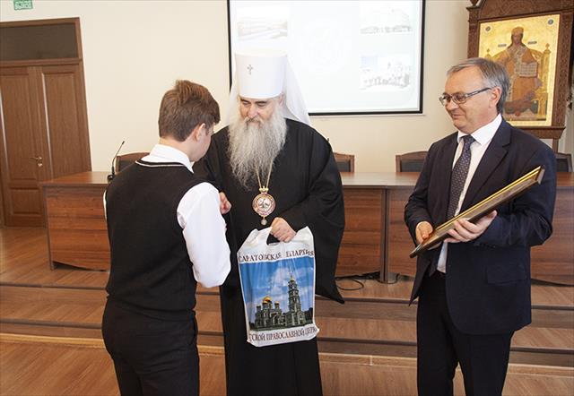 После подведения итогов полугодовой работы Митрополит Саратовский и Вольский Лонгин и ректор СГУ имени Н.Г. Чернышевского Алексей Николаевич Чумаченко вручили победителям и призерам дипломы, грамоты и памятные подарки. Владыка поздравил ребят и выразил надежду, что те творческие задания, которые были выполнены ими в рамках конкурса, и то, чему они научились в летней образовательной школе, пойдет им на пользу.