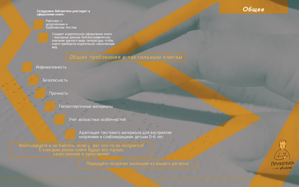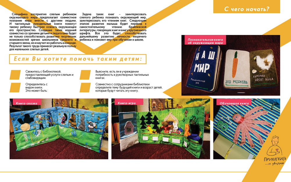 Центром развития творчества детей и юношества «Лабиринт», при поддержке международного открытого грантового конкурса «Православная инициатива 2015-2016», совместно с отделом библиотечного обслуживания граждан с ограничениями жизнедеятельности библиотеки имени А.И. Герцена разработано мультимедийное методическое пособие по созданию рукотворных тактильных книг для слепых и слабовидящих детей.