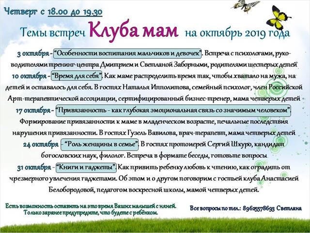 «На встречах мы обсуждаем самые разные темы. Но особенно нас интересуют красота, здоровье, саморазвитие, отношения с любимым, воспитание детей и забота о них. Также мы изучаем основы православной веры. Вход свободный», — отмечает Светлана.