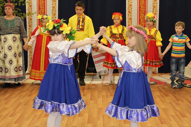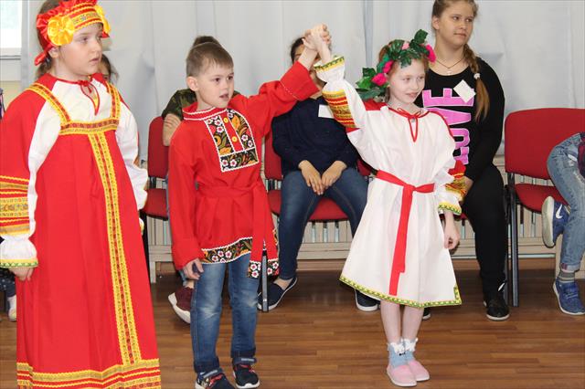 Несмотря на то, что из-за погодных условий праздник прошел в актовом зале школы, организаторы постарались соблюсти весь цикл традиций и обрядов: плетение венков, украшение березы, кумленье, хороводы, народные забавы.