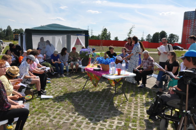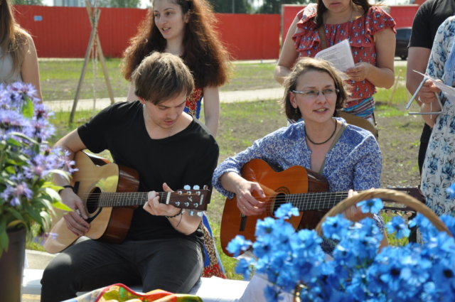 16 июня на зеленой лужайке в ЖК «Новая Охта» сотрудники и подопечные Службы собрались вместе, чтобы пообщаться и провести этот солнечный летний день в компании друзей и новых знакомых. Всех гостей ждал настоящий праздник под открытым небом и интересная интерактивная программа. На импровизированной сцене выступили четвероногие лохматые артисты – собаки-терапевты из Ассоциации поддержки канис-терапии. Вместе с музыкальными волонтерами Натальей, Марией, Александром и Сюзанной мы спели любимые старые песни, разучили новые мелодии и поиграли на музыкальных инструментах – барабане, бубне и трещотках. У каждого была возможность сделать снимки на память в яркой фотозоне, оформленной живыми васильками и нежно-голубыми воздушными шарами.