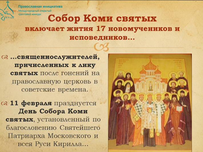 Национальная библиотека Республики Коми начала работу над проектом, победившим в Международном открытом грантовом конкурсе «Православная инициатива 2017-2018». Благодаря гранту будет создана интерактивная передвижная выставка-размышление «Святые новомученики земли Коми».