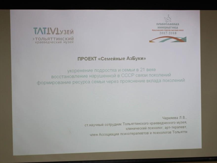 19 апреля в Тольяттинском краеведческом музее (ТКМ) состоялась первая презентация проекта ТКМ "Семейные АзБуки" (победителя Международного открытого грантового конкурса "Православная инициатива 2017-2018") перед профессиональным сообществом.